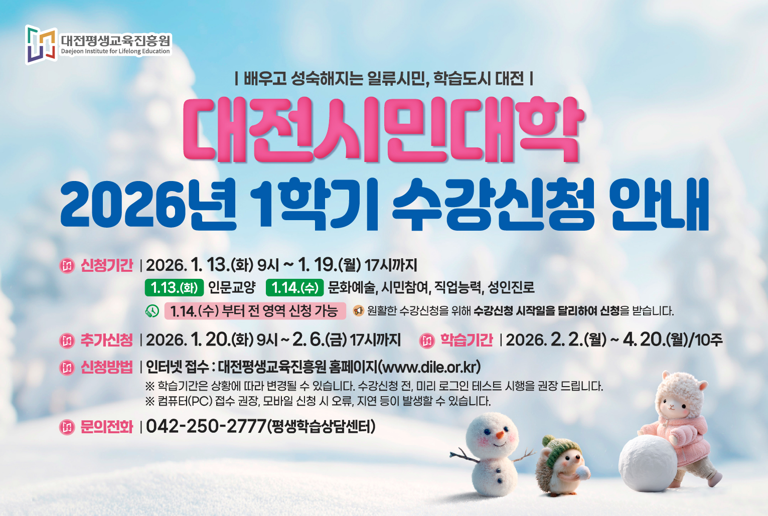 대전평생교육진흥원 공고 제2025-84호 2026년도 대전시민대학 강사 공개모집 재단법인 대전평생교육진흥원에서는 모든 시민을 위한 평생학습 프로그램을 운영하고 지속 가능한 평생학습 사회 실현을 위해 전문성과 역량을 갖춘 “2026년 대전시민대학”강사를 모집합니다. 평생학습에 관심 있는 강사들의 많은 지원 바랍니다. 2025년 11월 13일 (재)대전평생교육진흥원 모집대상 ❍ 모집대상: 5개 영역, 152여명 / [붙임]평생학습 프로그램 목록 참조 ※2026년 1학기 실시간 온라인 (ZOOM)으로 운영 / 2~4학기 대면수업 (사유: 대전시민대학 본관 건물 대공사 예정(내진설계, 리모델링)) 모집기간 ❍ 공고기간: 2025. 11. 13.(목) ~ 11. 26.(수) 17:00까지 ❍ 접수기간: 2025. 11. 24.(월) ~ 11. 26.(수) 17:00까지 ❍ 접수방법: 방문접수 / 우편, 이메일 등 접수 불가 ❍ 접 수 처: 대전평생교육진흥원 대전시민대학 본관 1층 * 12:00~13:00시 점심시간 및 주말에는 접수받지 않습니다. * 보다 자세한 사항은 모집 공고문을 참고해 주시기 바랍니다. 모집 공고문, 평생학습 프로그램 목록, 제출서류 양식 : 첨부파일확인